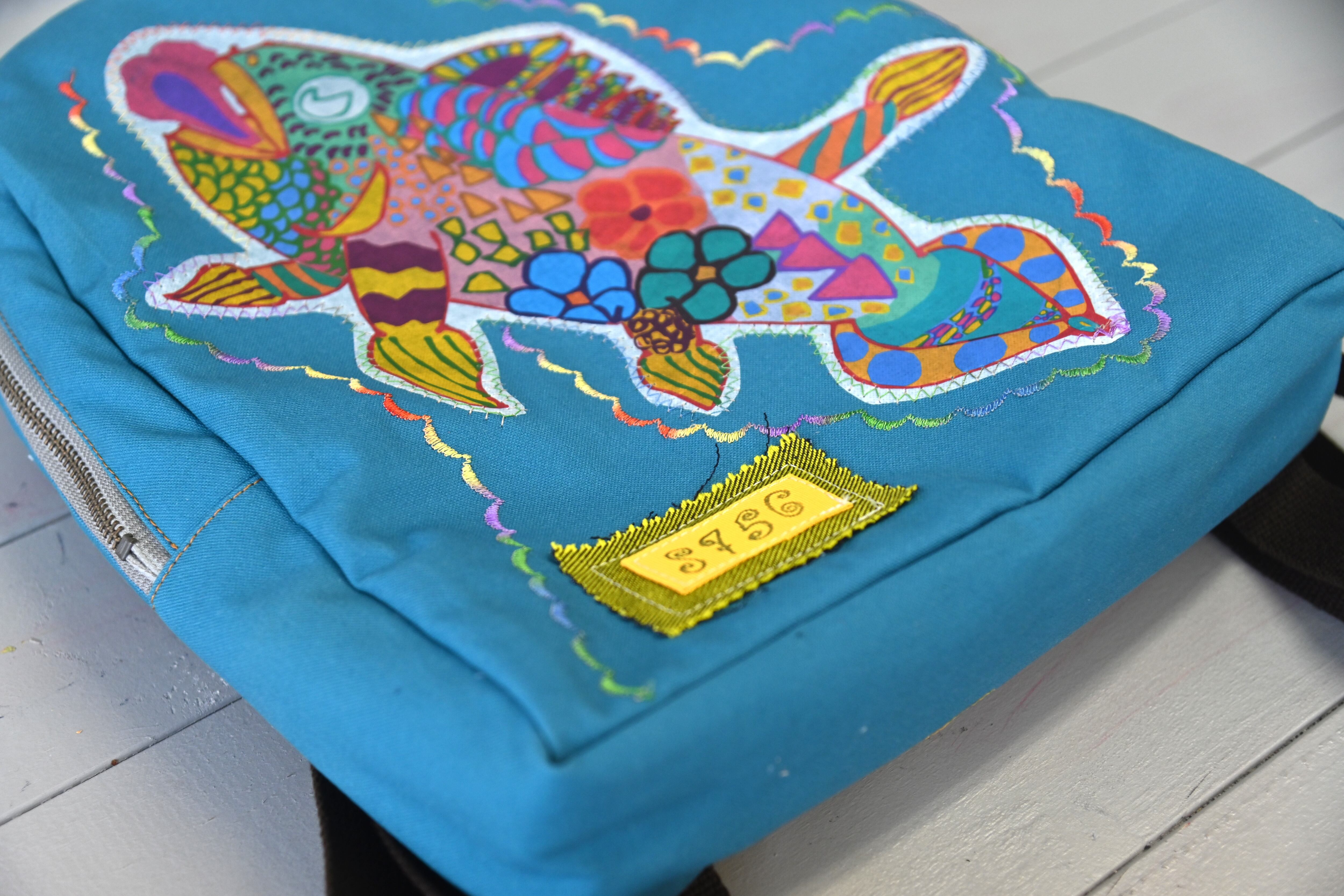 トートバッグ名:デイバッグ 絵画作品名:シーラカンスのバカンス 作者:ゆずゐ https://hananokoro.jp/memberfacility/1756/ 素材:帆布 サイズ(袋部):縦35センチ、横28センチ、マチ付き その他:中にポケットあり。高温アイロン不可