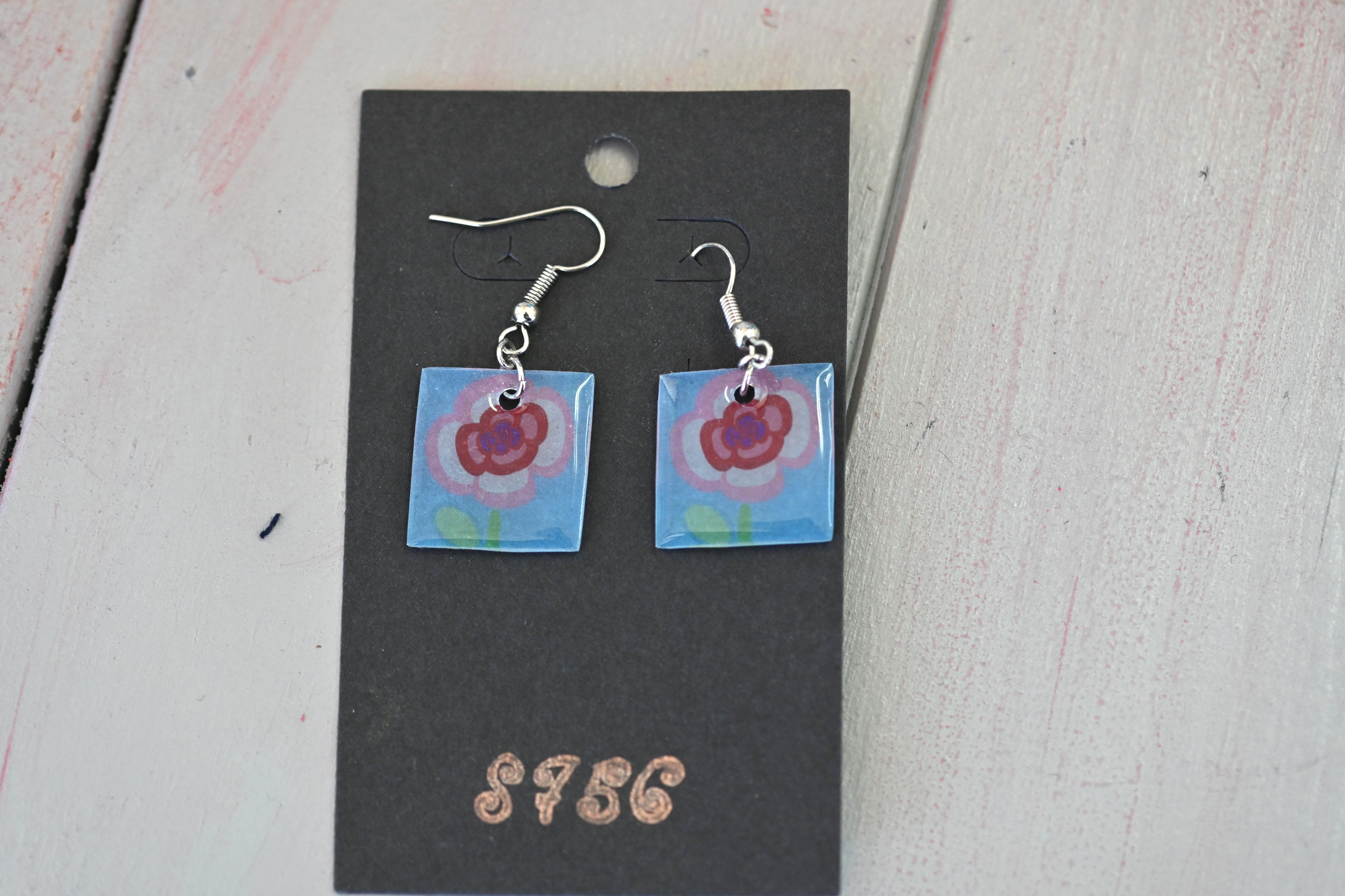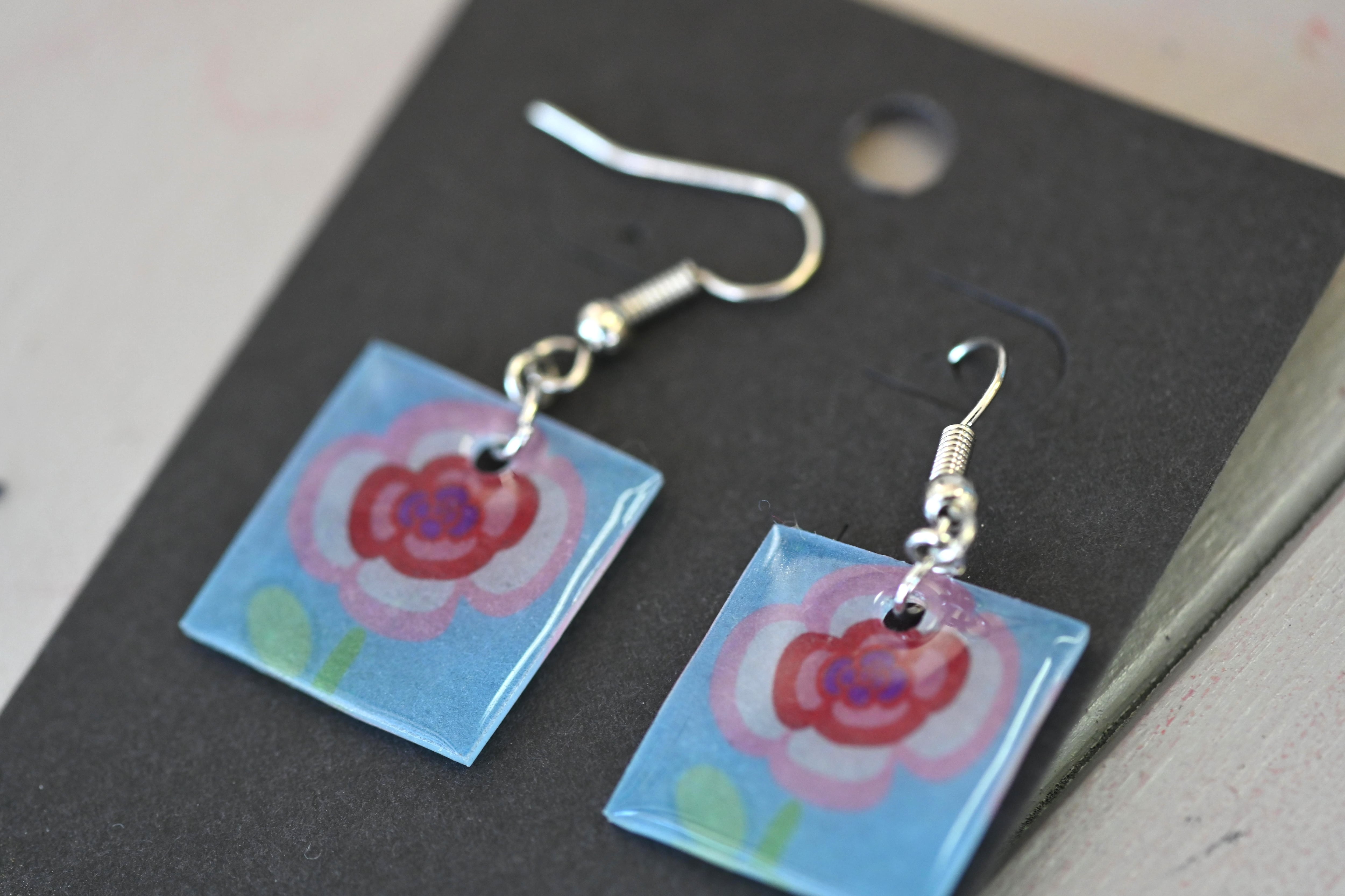 商品:ピアス 作者:茶々丸 https://hananokoro.jp/memberfacility/5363/ 素材:プラ板 サイズ:縦2.5センチ、横2.5センチ。