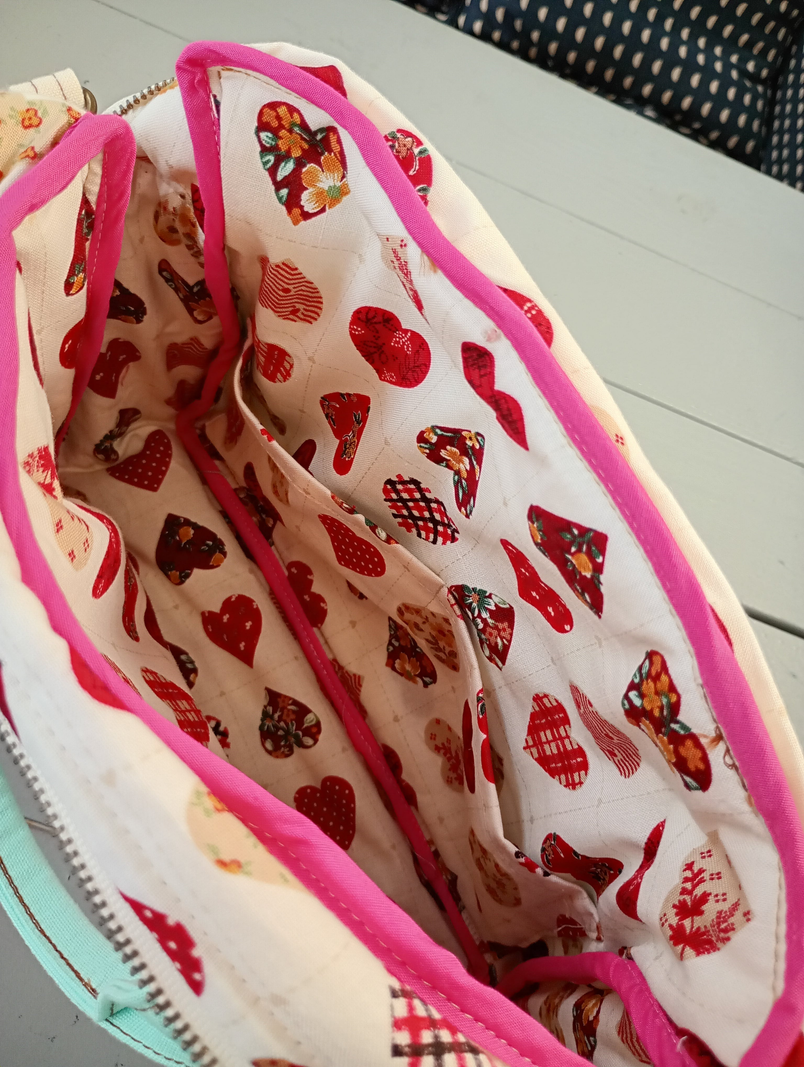 バッグを開ければ、内側には溢れんばかりのハート柄が。