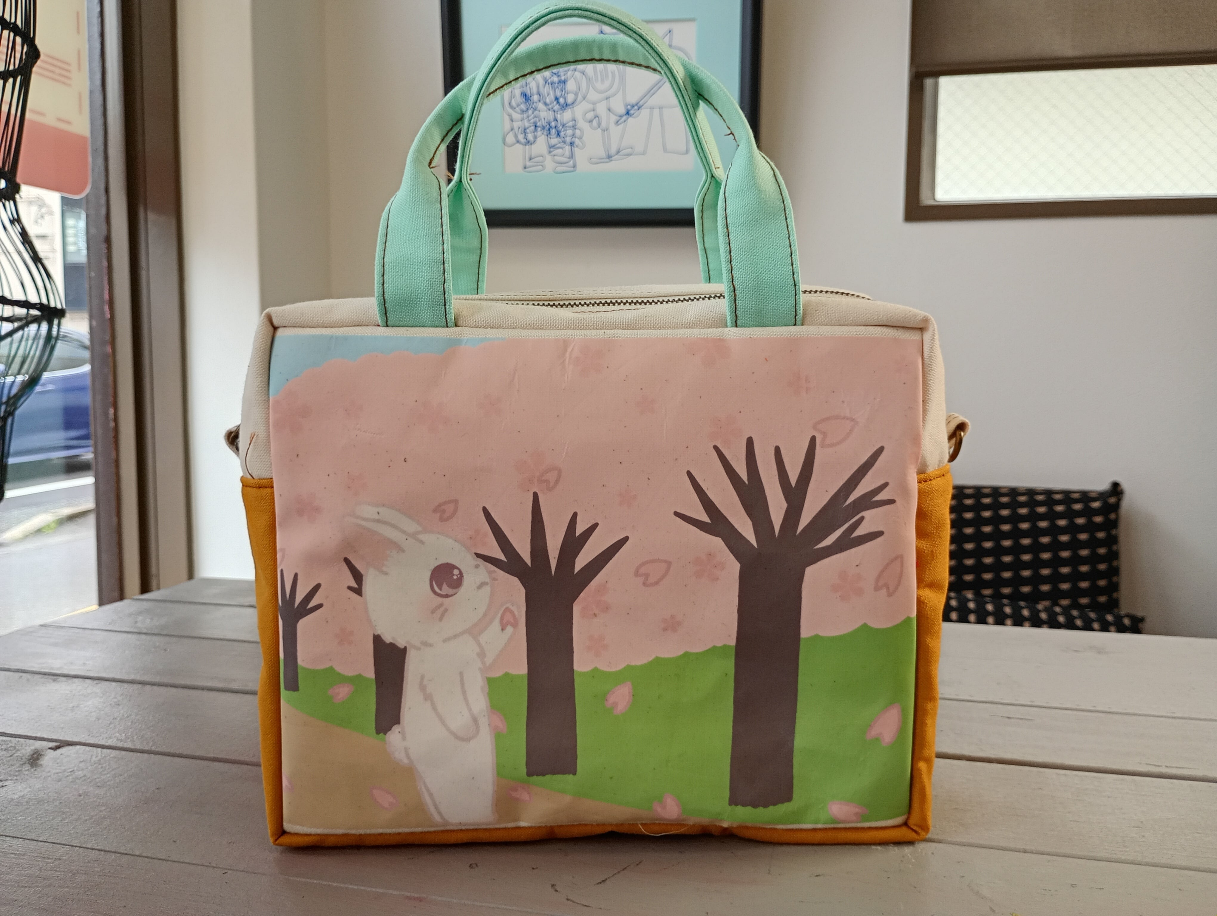満開の桜並木で、愛らしいウサギさんが佇む優しいアート。