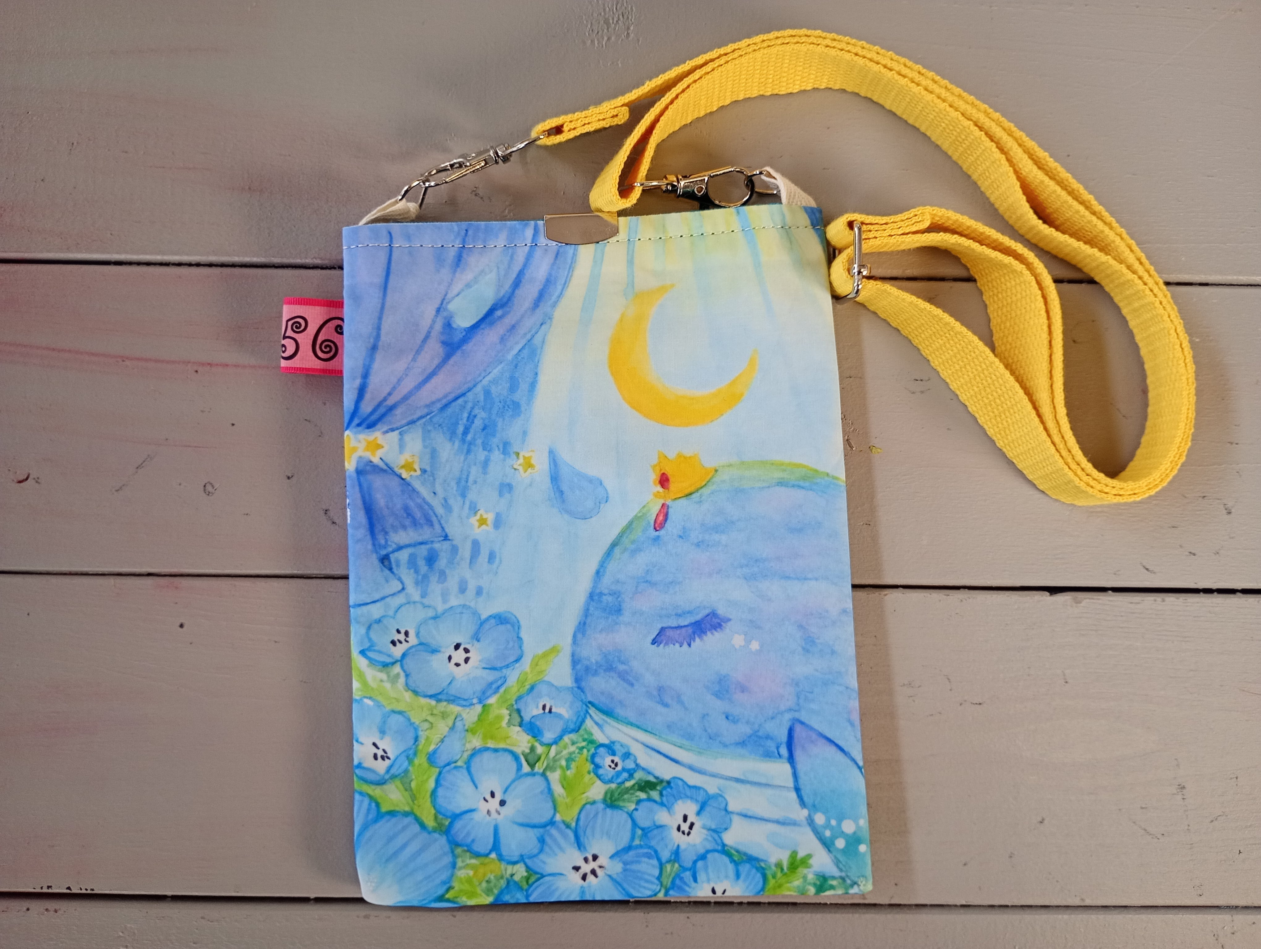 爽やかなブルーを背景に、お花畑、三日月、そして穏やかなクジラが描かれた、まるで夢の中のような世界観。